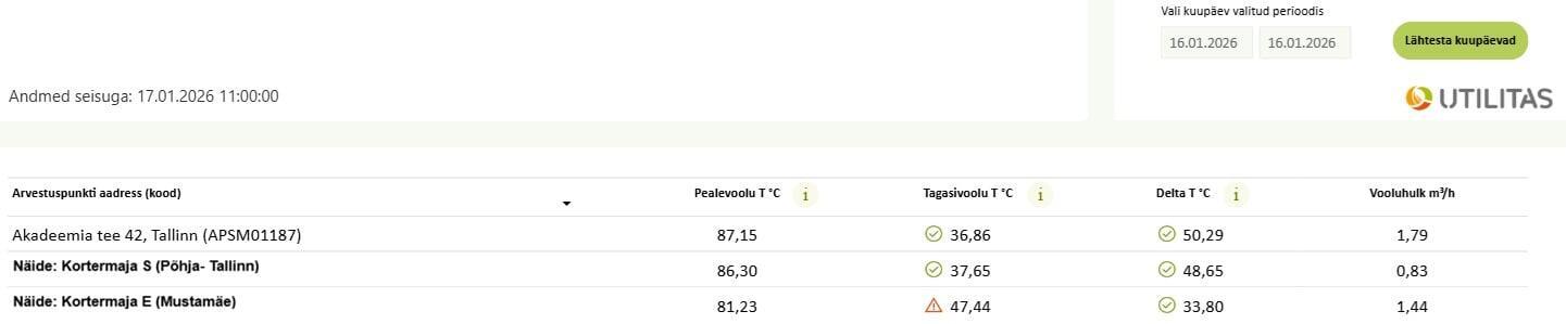 Kuupäeval 16.01.2026 mõõdetud temperatuurinäitajad (pealevool T1, tagasivool T2 ja temperatuuride vahe ΔT) näitavad selget erinevust kortermajade soojussõlmede töö efektiivsuses.